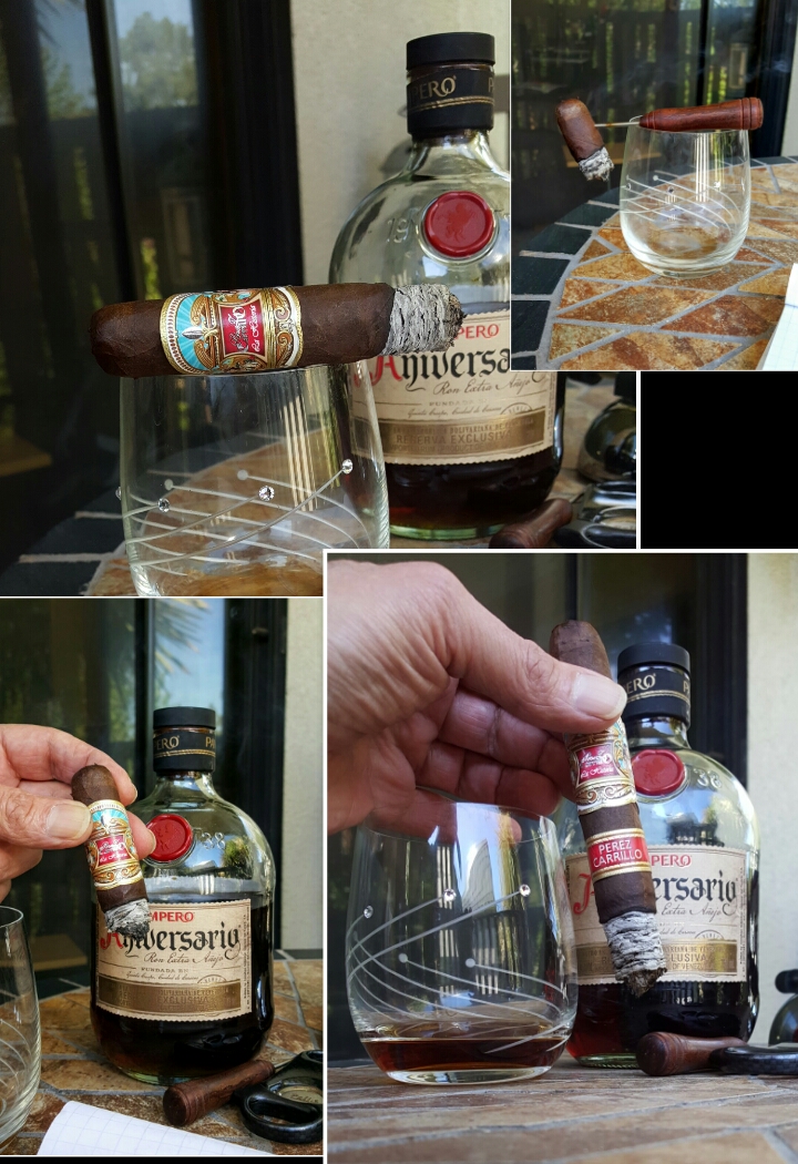 I smoked the first inch before trying the rum I chose to pair with this, my Pampero Aniversario R.E. This is a rum I haven’t reviewed here yet, but I will get around to it soon as it is one of the good ones. Before the rum I was getting all the flavors above and along the way some sweet spice like cinnamon crept in as did leather and a bit of mint. After I sipped the rum the cigar took on a strong licorish with sugar flavor, wow! I rarely experience such a dramatic flavor enhancement this way, but the licorish kept coming back every time I sipped the rum until about the last third when it faded away.