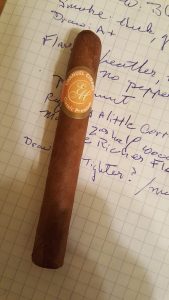 Flavor: Leather, flowers, warm sweet woodiness, nutty. No pepper to speak of on the taste until near the end, but there is some on the retrohale. The flavors include a certain meaty sourness that I find a lot in Dominican tobaccos. I don’t like it at all when it dominates the flavor, but here it mingles with enough sweetness, almost raw-sugar like, that it works. All the various flavors, even a cinnamon-like warm spice come and go throughout. The stick keeps its flavors until the nub. All good. Smoke time was about 50 minutes, about right for a small stick.
