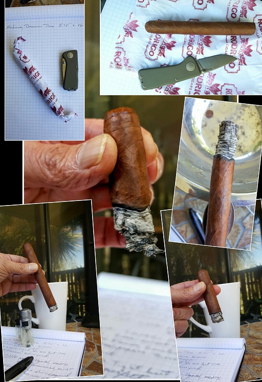 As the cigar gets into the second third there comes to be a little brown sugar, cedar, and some sweet spice. Burn stays perfect, draw consistent. Pepper stays consistent with other flavors coming and going. As compared to the last cigar, the Habana Dominican Puro, the sour note here is very faint, that’s good. As a faint note it adds complexity to the rest. I don’t like that flavor to dominate. At the last third the cigar is still sweet, still producing lots of creamy smoke. Perfect burn line and draw never changes. There is a little crack at the foot of the wrapper, but the cigar gets by that without any help from me. Some cracking around the head too as I get into the last few inches, but the wapper never really comes apart and continues to burn perfectly. Flavor and mild sweetness fade as the cigar gets down to the last inch, but it never completely goes away. I still taste some sweet mint. The pepper fades at the top of the third but then comes back at the end. Not a lot of transitions here, but complex well balanced flavors all the way along. Not strong flavor, but enough to be noticible.